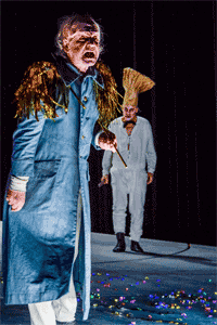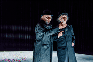 Zwei Stunden, in der die Satire und das Grauen Händchen halten, in Szenen, die bisweilen zu grandiosen Bildern gesteigert werden, und in denen die allesamt herausragend agierenden Schauspieler in herrlich absurden wie albernen Kostümierungen das wahre Ausmaß der Tragik von vor 100 Jahren (und von heute) deutlich machen. Harmlos wirkende Gespräche werden durch einfachste Mittel gespenstisch verstärkt. Es ist müßig, einzelne Szenen (und einzelne Schauspieler) hervorzuheben, denn egal ob die gruseligen Offiziere in ihren grindigen falsch geknöpften Staubmäntel oder die Kriegspresseberichterstatterin Alice Schalek, der Abonnent oder der patriotische Volksschullehrer, der Feldkurat mit seinem Riesenrüschenkragen oder sonst jemand aus dem Weltuntergangsirrenhaus die Szene betritt, das Ensemble schafft es mit jedem gesprochenen (und bisweilen gesungenen) Wort aus der Absolut-Satire von Karl Kraus das Optimum herauszuholen.